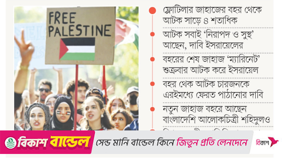 নতুন করে আরও ৯টি জাহাজের যাত্রা: গাজা সুমুদ ফ্লোটিলার নৌবহরের সব জাহাজ আটক হওয়ার পর ফ্রিডম ফ্লোটিলা কোয়ালিশন (এফএফসি) নতুন করে আরও ৯টি জাহাজ নিয়ে গাজা অভিমুখে যাত্রার কথা জানিয়েছে। এই বহরে প্রায় ১০০ জন অধিকারকর্মী রয়েছেন, যাদের মধ্যে সাংবাদিক, চিকিৎসক এবং বিভিন্ন দেশের মানবাধিকার কর্মীরা আছেন। বাংলাদেশের আলোকচিত্রী শহিদুল আলম এই বহরের সবচেয়ে বড় জাহাজ ‘কনসায়েন্স’-এ রয়েছেন বলে তিনি এক ভিডিও বার্তায় জানিয়েছেন। এফএফসি জানিয়েছে, এই মিশন ইসরায়েলের অবৈধ অবরোধ এবং সাংবাদিকদের গাজায় প্রবেশে বাধা দেওয়ার বিরুদ্ধে একটি প্রতিরোধমূলক পদক্ষেপ। তারা বলছেন, গাজার স্বাস্থ্য ব্যবস্থা কার্যত ধ্বংস হয়ে পড়েছে এবং সাংবাদিকরা সেখানে জীবনের ঝুঁকি নিয়ে কাজ করছেন।