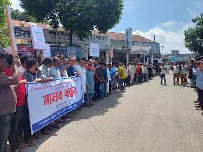 ভাঙ্গুড়া প্রতিনিধিঃ পাবনার ভাঙ্গুড়ায় পাবনা মোটর শ্রমিক ইউনিয়নের ভাঙ্গুড়া উপজেলা শাখার সভাপতি ও ভাঙ্গুড়া পৌর বিএনপি-র সাংগঠনিক সম্পাদক মোতালেব হোসেন এর ৫০ হাজার টাকা চাঁদাদাবির প্রতিবাদে শিল্প ও বণিক সমিতির ব্যনারে মানববন্ধন ও বিক্ষোভ মিছিল করেছে। মঙ্গলবার (২৩ সেপ্টেম্বর) বেলা ১১ টার দিকে উপজেলার পৌর সদরের ভাঙ্গুড়া বাজারের বকুলতলা চত্বরে ঘন্টা ব্যাপী মনববন্ধন পালন করেন। এতে শরৎনগর ও ভাঙ্গুড়া বাজারের শতাধিক ব্যবসায়ী অংশ গ্রহণ করেন। পরে ব্যবসায়ীরা ভাঙ্গুড়া বাজারে একটি বিক্ষোভ মিছিল করেন।