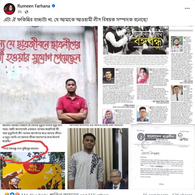 সোমবার (২৫ আগস্ট) রুমিন ফারহানা ফেসবুকে নিজের ভেরিফায়েড অ্যাকাউন্টে লিখেছেন, ‘এটা ওই ফকিন্নির বাচ্চাটা (হাসনাত আব্দুল্লাহ) না, যে আমাকে আওয়ামী লীগ বিষয়ক সম্পাদক বলেছে?’ এ সময় তিনি হাসনাত আব্দুল্লাহর আওয়ামী লীগ ও ছাত্রলীগের সঙ্গে যুক্ত থাকার বিভিন্ন ছবি ও প্রমাণ পোস্টে সংযুক্ত করেছেন।