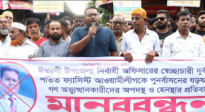 পাবনা প্রতিনিধি: পাবনার ঈশ্বরদীতে উপজেলা নির্বাহী অফিসার (ইউএনও) মনিরুজ্জামানের বিরুদ্ধে স্বেচ্ছাচারিতা ও গণঅভ্যুত্থানে অংশগ্রহণকারী ছাত্র জনতার সঙ্গে দুর্ব্যবহারের অভিযোগে মানববন্ধন অনুষ্ঠিত হয়েছে। তবে অভিযোগগুলো সম্পূর্ণ মিথ্যা ও উদ্দেশ্যপ্রণোদিত বলে দাবি করেছেন উপজেলা নির্বাহী অফিসার মনিরুজ্জামান।