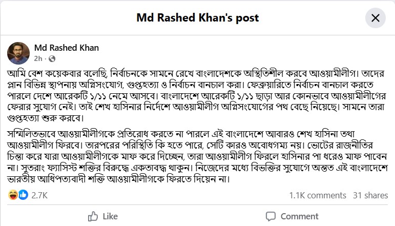 পরিশেষে তিনি লেখেন, সুতরাং ফ্যাসিস্ট শক্তির বিরুদ্ধে একতাবদ্ধ থাকুন। নিজেদের মধ্যে বিভক্তির সুযোগে অন্তত এই বাংলাদেশে ভারতীয় আধিপত্যবাদী শক্তি আওয়ামী লীগকে ফিরতে দিয়েন না।