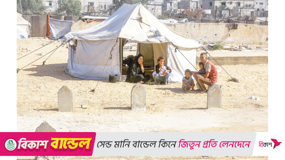 গাজার হাজার হাজার বাস্তুচ্যুত মানুষ এখন কবরস্থানে তাঁবু ফেলছেন। তাদের ঘরবাড়ি নেই বা ফেরার মতো অন্য কোনো আশ্রয়ও নেই। ইসরায়েলি হামলায় গাজাজুড়ে ঘরবাড়ি ধ্বংস হয়ে যাওয়ার পর কবরস্থানগুলোই হয়ে উঠেছে তাদের শেষ আশ্রয়স্থল। যুদ্ধবিরতির চুক্তি কার্যকর হলেও মানবিক বিপর্যয় এখনো ভয়াবহ।