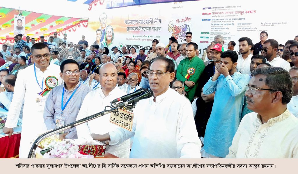 এম এ আলিম রিপন ঃ আওয়ামী লীগের প্রেসিডিয়াম সদস্য আব্দুর রহমান বলেছেন, আওয়ামীলীগ এদেশে গণতন্ত্র প্রতিষ্ঠা করেছে। দেশের মানুষের ভাগ্য পরিবর্তনের জন্য অবিরাম সংগ্রাম করে যাচ্ছেন প্রধানমন্ত্রী জননেত্রী শেখ হাসিনা । সকল ষড়যন্ত্রকে বৃদ্ধাঙ্গুলি দেখিয়ে শেখ হাসিনার নেতৃত্বে এগিয়ে যাচ্ছে বাংলাদেশ। আগামী ২০২৪ সালের জানুয়ারি মাসে জাতীয় সংসদ নির্বাচন অনুষ্ঠিত হবে । সেই নির্বাচন শেখ হাসিনার নেতৃত্বে নির্বাচনকালীন সরকার ও স্বাধীন নির্বাচন কমিশনের অধীনেই অনুষ্ঠিত হবে। এই নির্বাচনে কে অংশগ্রহন করলো আর কে করলো না সেটা দেখার বিষয় নয়। জনগণ স্বতঃস্ফূর্তভাবে ভোট কেন্দ্রে গিয়ে তারা তাদের ভোটাধিকার প্রয়োগ করবেন। তিনি বলেন,বেগম খালেদা জিয়া বলেছিলেন আওয়ামী লীগ পদ্মা সেতু করতে পারবে না, করলেও সাধারণ মানুষ সেই সেতু দিয়ে চলাচল করবে না। বর্তমান প্রধানমন্ত্রী শেখ হাসিনা দেখিয়ে দিয়েছেন কিভাবে নিজেদের অর্থায়নে পদ্মা সেতুর মতো এরকম প্রকল্প বাস্তবায়ন করতে হয়। শনিবার পাবনার সুজানগর এন এ কলেজ মাঠে উপজেলা আওয়ামী লীগের ত্রি-বার্ষিক সম্মেলনে প্রধান অতিথির বক্তব্যে তিনি আরো বলেন, বিএনপি-জামায়াতসহ স্বাধীনতা বিরোধী অশুভ রাজনৈতিক দলগুলো যদি ফের রাজপথ দখলের অপচেষ্টা করে, দেশে নতুন ভাবে নৈরাজ্য তৈরির অপচেষ্টা করে অথবা রাজপথ দখলের নামে মানুষ পোড়ানোর অপচেষ্টা করে; তাহলে তাদের দাতভাঙা জবাব দিতে হবে। এজন্য আওয়ামী লীগের সর্বস্তরের নেতাকর্মীদের চোখ-কাল খোলা রাখতে হবে। আব্দুর রহমান বলেন, ৭৫’এ ১৫ আগস্ট এর পর পিতা হারানোর বেদনা ও কষ্ট নিয়ে দেশের মাটিতে ফিরে আসেন বঙ্গবন্ধুকন্যা শেখ হাসিনা। সারা বাংলাদেশের লক্ষ লক্ষ মানুষ প্রিয় নেত্রীকে এক নজর দেখার জন্য ছুটে এসেছিলেন। সেদিন বুকভরা কষ্ট নিয়ে বঙ্গবন্ধুকন্যা শেখ হাসিনা বলেছিলেন, আমার জীবনে কখনও আমি ভাবি নাই রাজনীতিতে আমাকে আসতে হবে। কখনও ভাবি নাই পিতা হত্যার বিচার করতে আমার জীবন উৎসর্গ করতে হবে। সেদিন তিনি বলেছিলেন, ওই খুনীদের বিচার বাংলার মাটিতে আমি করব। বলেছিলেন, আমার বাবা (বঙ্গবন্ধু) যে স্বপ্নের সোনার বাংলা গঠন করতে চেয়েছিলেন, আমি তা বাস্তবায়ন করব। আজ তিনি যে স্বপ্ন নিয়ে অদম্য গতিতে এগিয়ে যাচ্ছেন। সেই স্বপ্ন বাস্তবায়নে কোনো ষড়যন্ত্র যেনো বাঁধা হয়ে দাড়াতে না পারে, সেজন্য আওয়ামী লীগের সর্বস্তরের নেতাকর্মীরা আজ ঐক্যবদ্ধ। কোনো ষড়যন্ত্র শেখ হাসিনার এই উন্নয়ন অগ্রগতিকে বাঁধাগ্রস্ত করতে পারবে না।তিনি বলেন, ৭৫’এ ১৫ আগস্ট। ভোরের সূর্য তখনও আমাদের ঘরে পৌঁছায়নি। ঠিক সেই মুহূর্তে আমরা শুনেছিলাম আমাদের পিতা বঙ্গবন্ধু আর নেই। তার লাশ ধানমন্ডির ৩২ নম্বর বাড়িতে পড়ে ছিল। সেদিন ইতিহা