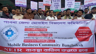 পাবনায় মোবাইল ফোনের সকল দোকান অনির্দিষ্টকালের জন্য বন্ধ ঘোষণা করেছে পাবনা জেলা মোবাইল বিজনেস কমিউনিটি। এনইআইআর ব্যবস্থা বাতিলের দাবিতে বিক্ষোভ মিছিল করেন তারা।