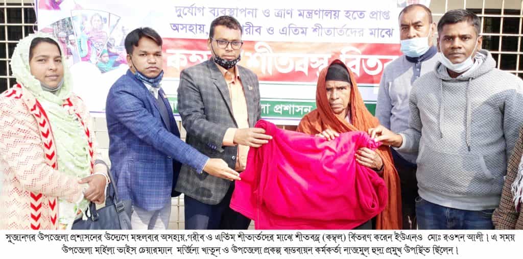 এম এ আলিম রিপনঃ সুজানগরে জেঁকে বসেছে শীত। এই শীতে অসহায় হয়ে পড়েছে সাধারণ মানুষ। শীত নিবারণের সামর্থ্য নেই অনেকের। আর সেই সব গরীব, দুস্থ, এতিম ও অসহায় মানুষদের পাশে দাঁড়ালেন সুজানগর উপজেলা প্রশাসন। মঙ্গলবার উপজেলা নির্বাহী অফিসার মোঃ রওশন আলী প্রধান অতিথি হিসেবে উপস্থিত থেকে উপজেলার গরীব, দুস্থ, এতিম ও অসহায় মানুষদের মাঝে বিতরণ করলেন শীতবস্ত্র(কম্বল)। এ সময় উপজেলা পরিষদের মহিলা ভাইস চেয়ারম্যান মর্জিনা খাতুন ,উপজেলা প্রকল্প বাস্তবায়ন কর্মকর্তা নাজমুল হুদা,উপজেলা একাডেমিক সুপারভাইজার মনোয়ার হোসেন প্রমুখ উপস্থিত ছিলেন। বিতরণকালে উপজেলা নির্বাহী অফিসার রওশন আলী বলেন সুজানগরের গরীব, দুস্থ, এতিম ও অসহায় মানুষদের মাঝে মাননীয় প্রধানমন্ত্রীর পক্ষ হতে শীতবস্ত্র বিতরণ করা হচ্ছে। আর সুজানগরের একটি মানুষও যেন এই শীতে কষ্ট না পায় সে জন্য এবারেও যতদিন শীত থাকবে ততদিন জেলা প্রশাসন ও উপজেলা প্রশাসন শীতবস্ত্র বিতরণের এ কর্মসূচি অব্যাহত রাখবে।