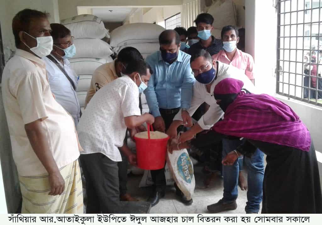 সাঁথিয়া প্রতিনিধিঃ পাবনার সাঁথিয়া উপজেলার আর.আতাইকুলা ইউনিয়ন পরিষদে প্রধানমন্ত্রীর ঈদ উপহারে অসহায় দুঃস্থদের মাঝে চাল বিতরন করা হয়েছে। সোমবার সকাল ৯টায় আর.আতাইকুলা ইউনিয়ন পরিষদের আয়োজনে সামাজিক দুরত্ত বজায় রেখে আতাইকুলা মাধপুর আমেনা খাতুন ডিগ্রি কলেজ মাঠে এ চাল বিতরন করা হয়। পরিষদ সুত্র জানায় ইউনিয়নের ২২৪৫ জনকে ১০ কেজি করে চাল দেয়া হয়। এসময় উপস্থিত ছিলেন সাঁথিয়া উপজেলা মহিলা বিষয়ক কর্মকর্তা মোঃ আলমগীর কবির, আর.আতাইকুলা ইউনিয়ন পরিষদের চেয়ারম্যান আলহাজ মিরাজুল ইসলাম বিশ্বাস, ইউপি সচীব রফিকুল ইসলাম, ছাত্রলীগ সভাপতি আনোয়ার হোসেন, ইউপি সদস্যা নাছিমা খাতুন, সদস্য শাহীন হোসেন গোল্লা, বাচ্চু, আঃ রাজ্জাকসহ ইউপি সদস্য- সদস্যা ও স্থানীয় গন্যমান্য ব্যক্তি।