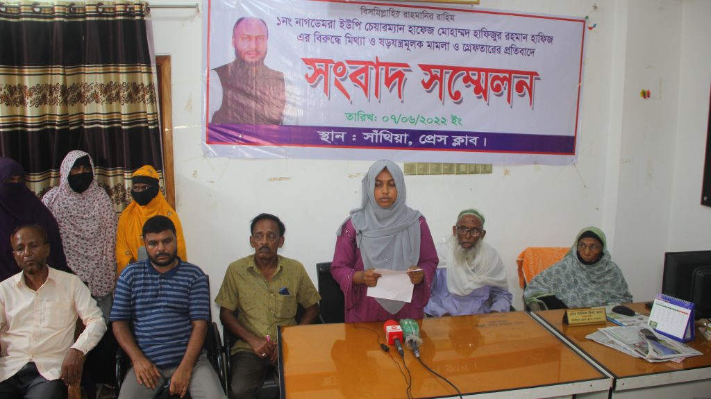 সাঁথিয়া(পাবনা)প্রতিনিধিঃ পাবনার সাঁথিয়া উপজেলার নাগডেমরা ইউনিয়ন পরিষদের চেয়ারম্যান মোহাম্মদ হাফিজুর রহমানকে গ্রেফতারকে ষড়যন্ত্র বলে দাবি করেছে তার পরিবার। মঙ্গলবার দুপুরে সাঁথিয়া প্রেসক্লাবে আয়োজিত সংবাদ সম্মেলনে লিখিত বক্তব্য এ দাবি করেন চেয়ারম্যানের স্ত্রী মিতু খাতুন।