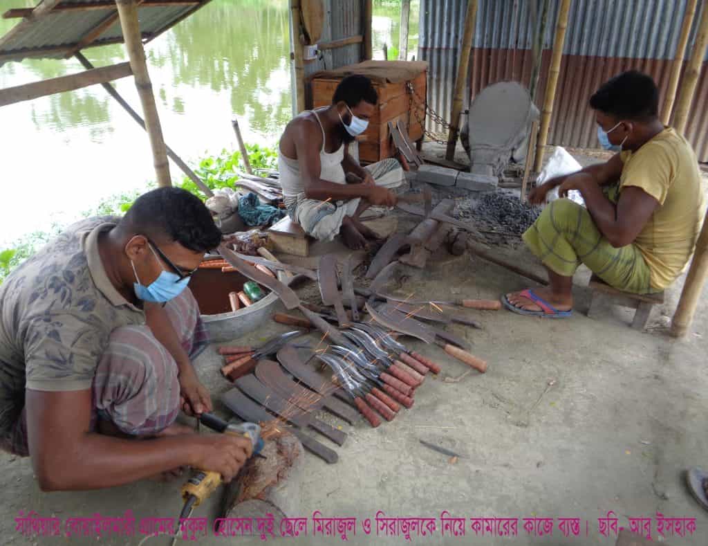 ঈদুল আযহা উপলক্ষে বাড়তি চাহিদা থাকায় ছুরি, দা, বটি, চাকু, চাপাতি তৈরিতে পরিবারের সদস্যদেরও যেন নেই কোন বিশ্রাম। পরিবার প্রধানের সাথে স্ত্রী ও সন্তানরা হাত লাগিয়ে এগিয়ে নিচ্ছে কাজের গতি।