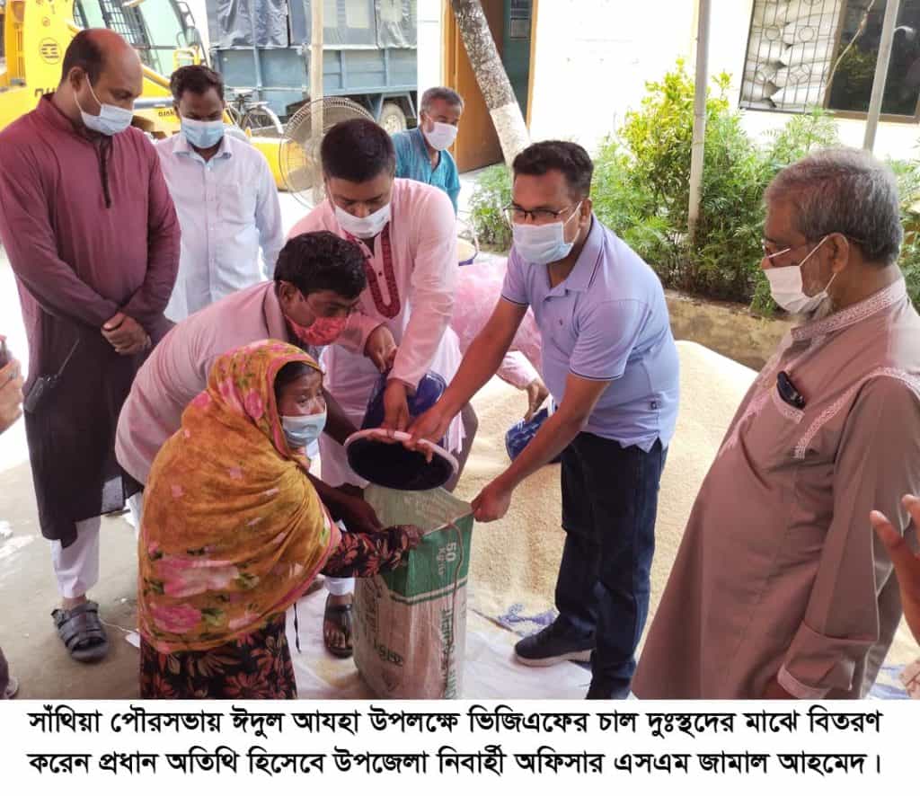 সাঁথিয়া(পাবনা)প্রতিনিধিঃ পাবনার সাঁথিয়া পৌরসভায় ঈদুল আযহা উপলক্ষে ভিজিএফের খাদ্যশস্য সহায়তা হিসাবে ৪ হাজার ৬শ’ ২১টি দুঃস্থ/অতিদরিদ্র ব্যাক্তি/পরিবারকে ১০ কেজি করে চাল বিতরণের আয়োজন করা হয়। এ উপলক্ষে শুক্রবার (১৬ জুলাই) সকাল ১১টায় পৌর কার্যালয়ে চাল বিতরণ উদ্বোধন করেন উপজেলা নির্বাহী অফিসার এসএম জামাল আহমেদ। এ সময় উপস্থিত ছিলেন, পৌর মেয়র মাহবুবুল আলম বাচ্চু, সাঁথিয়া থানা ভারপ্রাপ্ত কর্মকর্তা আসিফ মোহাম্মদ সিদ্দিকুল ইসলাম, পৌর আ’লীগের সভাপতি আবুল কাশেম ও কাউন্সিলর বৃন্দ।##