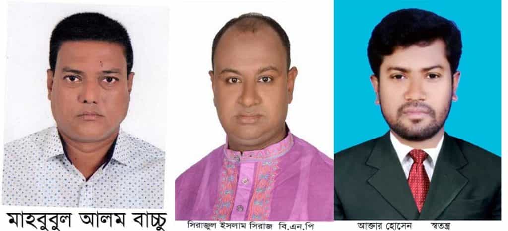 বাংলাদেশ জাতীয়তাবাদী দলের মনোনীত প্রার্থী সিরাজুল ইসলাম সিরাজ পৌর বিএনপি’র সাবেক সাধারন সম্পাদক ও বিগত পৌর নির্বাচনে প্রতিদ্ব›িদ্বতা করে ছিলেন। এবারও ধানের শীষ প্রতিক নিয়ে জনগনের নিকট ভোট চাচ্ছেন। তিনি জানান, নৌকার প্রার্থীর কর্মীরা তার পরিবারসহ কর্মীদের নামে মামলা দিয়ে আটক করেছে। তাকেসহ সমর্থকদের বাড়ী ছাড়ার হুমকি দেয়া হচ্ছে, কেন্দ্রে ঢুকতে দিবে না, কেন্দ্র দখল করে প্রকাশ্যে সিল মারবে বলে ভয়ভীতি দেখাচ্ছে। তবে সুষ্ঠ নির্বাচন হলে তিনিই বিজয়ী হবেন বলে আশা প্রকাশ করেন।