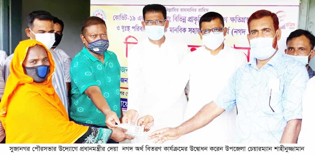 এম এ আলিম রিপনঃ করোনা পরিস্থিতিতে পবিত্র ঈদুল আজহাকে সামনে রেখে সুজানগর পৌর শহরের নয়টি ওয়ার্ডের নি¤œ আয়ের অসহায় হতদরিদ্র ৬০০জন নারী-পুরুষের মধ্যে প্রধানমন্ত্রীর বিশেষ সহায়তা উপহার হিসেবে নগদ অর্থ এবং ১৫০ জন নারী-পুরুষের মাঝে খাদ্য সহায়তা প্রদান করা হয়েছে। সুজানগর পৌরসভার উদ্যোগে এবং প্রধানমন্ত্রীর ত্রাণ ও দুর্যোগ তহবিল থেকে বৃহস্পতিবার সুজানগর সরকারি মডেল পাইলট উচ্চ বিদ্যালয় মাঠে করোনায় কর্মহীন ও বিভিন্ন ভাবে দুর্যোগে ক্ষতিগ্রস্থ অসহায় ও দুস্থ ৬০০জন নারী-পুরুষের মাঝে ৫০০ টাকা করে নগদ অর্থ এবং ১৫০জনের মাঝে খাদ্য সহায়তা হিসেবে ২০ কেজি করে চাল বিতরণ করা হয়। সুজানগর পৌর মেয়র রেজাউল করিম রেজার সভাপতিত্বে ও পৌর সচিব গোলাম নবীর সঞ্চালনায় এ বিতরণ কার্যক্রমের উদ্বোধনী অনুষ্ঠানে প্রধান অতিথির বক্তব্য রাখেন উপজেলা পরিষদের চেয়ারম্যান শাহীনুজ্জামান শাহীন। এ সময় ট্যাগ অফিসার সাইদুল ইসলাম, সুজানগর উপজেলা পূজা উদযাপন পরিষদের সভাপতি শ্রী সুবোধ কুমার নটো,উপজেলা আওয়ামীলীগের সদস্য মাহমুদুজ্জামান মানিক, পৌর কাউন্সিলর জাকির হোসেন, মুশফিকুর রহমান,পাশু সরদার ও সুজানগর প্রেসক্লাবের সাধারণ সম্পাদক এম এ আলিম রিপন সহ স্থানীয় বিভিন্ন পর্যায়ের ব্যক্তিবর্গ উপস্থিত ছিলেন। এদিকে করোনা পরিস্থিতিতে প্রধানমন্ত্রীর দেওয়া বিশেষ উপহার নগদ অর্থ ও খাদ্য সহায়তা হাতে পেয়ে খুশি সুজানগর পৌরসভার হতদরিদ্র মানুষেরা। অনুষ্ঠানে প্রধান অতিথির বক্তব্যে উপজেলা চেয়ারম্যান শাহীনুজ্জামান শাহীন বলেন, প্রধানমন্ত্রী জননেত্রী শেখ হাসিনা যতদিন বেঁচে আছেন ততদিন বাংলাদেশের একটি মানুষও না খেয়ে থাকবেনা।