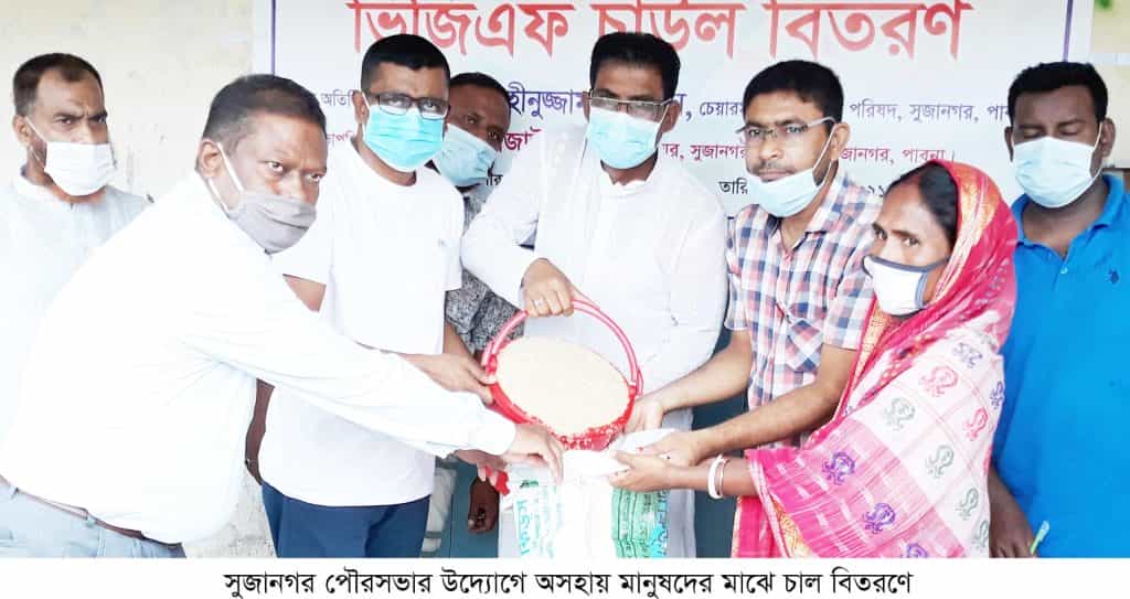 এম এ আলিম রিপন ঃ পবিত্র ঈদুল আজহা উপলক্ষে সুজানগর পৌরসভার হতদরিদ্র ও অতিদরিদ্র মানুষদের মাঝে ভিজিএফের চাল বিতরণ কার্যক্রমের উদ্বোধন করা হয়েছে। সুজানগর পৌরসভার উদ্যোগে সোমবার(১৯ জুলাই) সকালে সুজানগর সরকারি মডেল পাইলট উচ্চ বিদ্যালয় মাঠে স্বাস্থ্যবিধি মেনে এ চাল বিতরণ কার্যক্রমের উদ্বোধন করেন উপজেলা পরিষদের চেয়ারম্যান ও উপজেলা আওয়ামীলীগের সাধারণ সম্পাদক শাহীনুজ্জামান শাহীন। সুজানগর পৌর মেয়র রেজাউল করিম রেজার সভাপতিত্বে¡ ও পৌর সচিব গোলাম নবীর সঞ্চালনায় উদ্বোধনী অনুষ্ঠানে কাউন্সিলরগন,পৌরসভার প্রধান সহকারি মাসুদ রানা,পৌরসভার কঞ্জারভেন্সী ইনস্পেক্টর হাসান উদ্দিন সহ স্থানীয় বিভিন্ন পর্যায়ের ব্যক্তিবর্গ উপস্থিত ছিলেন। সংশ্লিষ্ট সুত্রে জানাযায়, সুজানগর পৌরসভার ৬৬২১ জন হতদরিদ্র ও অতিদরিদ্রদের প্রত্যেকে ১০ কেজি করে ভিজিএফের এ চাল বিতরণ করা হয়।