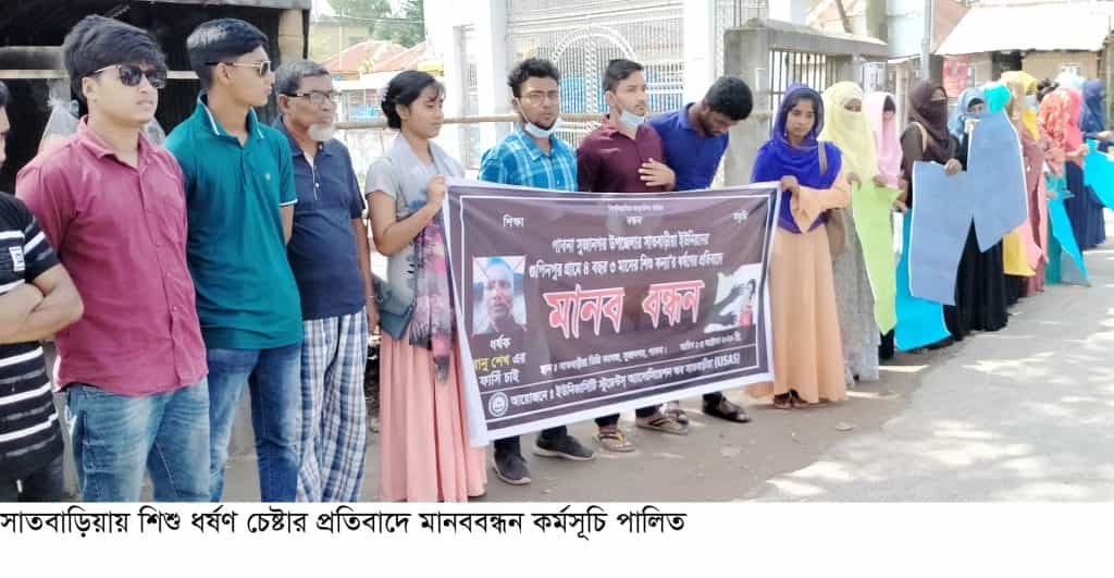 এম এ আলিম রিপনঃ সুজানগরে ৪ বছরের এক শিশুকে ধর্ষণ চেষ্টার প্রতিবাদ ও মামলার একমাত্র আসামি রানু শেখ (৫০) কে দ্রæত গ্রেফতারের দাবিতে মানববন্ধন কর্মসূচি পালিত হয়েছে। শনিবার(০৩ অক্টোবর) বেলা ১১টায় সাতবাড়িয়া ডিগ্রী কলেজের সামনে স্টুডেন্টস্ অ্যাসোসিয়েশন অব সাতবাড়িয়া এর আয়োজনে এক ঘন্টাব্যাপি এ মানববন্ধন কর্মসূচি পালিত হয় । মানববন্ধনে স্টুডেন্টস্ অ্যাসোসিয়েশন অব সাতবাড়িয়া এর সভাপতি সজিব হোসেন অবাক, সাধারণ সম্পাদক রইজ উদ্দিন ও সংগঠনটির অন্যান্য সদস্যবৃন্দ সহ বিভিন্ন শ্রেণী-পেশার মানুষ অংশ নেন। মানববন্ধনে বক্তারা বলেন এ ঘটনায় মামলা করার প্রায় এক সপ্তাহ পার হতে চললেও আসামী রানু শেখ এখনো গ্রেফতার হয়নি। ধর্ষণ চেষ্টাকারী রানু শেখ প্রভাবশালী হওয়ায় টাকার জোরে এখনো পুলিশের অধরা। উল্লেখ্য গত ২৫ সেপ্টেম্বর সুজানগর উপজেলার সাতবাড়িয়া ইউনিয়নের গুপিনপুর গ্রামের ৪ বছরের এক শিশুকে জোড়পূর্বক ধর্ষণ চেষ্টা চালায় স্থানীয় এলাকার রানু শেখ (৫০)। এ সময় শিশুটির চিৎকারে স্বজনেরা ছুটে এলে কৌশলে পালিয়ে যায় রানু শেখ। পরে শিশুটিকে উদ্ধার করে হাসপাতালে চিকিৎসা করানোর পর শিশুটির মা গত ২৮ সেপ্টেম্বর বাদী হয়ে সুজানগর থানায় একটি ধর্ষণ চেষ্টা মামলা দায়ের করে। কিন্তু মামলার প্রায় এক সপ্তাহ পার হতে চললেও ধর্ষণ চেষ্টাকারী রানু শেখকে এখনো গ্রেফতার করতে পারেনি থানা পুলিশ। স্থানীয় সুশীল সমাজের নেতৃবৃন্দ বলেন অভিযুক্ত শিশু ধর্ষণ চেষ্টাকারী এখনো গ্রেফতার না এলাকাবাসীর মধ্যে চরম ক্ষোভ বিরাজ করছে। তারা এ ঘটনার আসামী রানু শেখকে দ্রæত গ্রেফতার করে আইনের আওতায় এনে দৃষ্টান্তমূলক শাস্তির দাবি জানান সংশ্লিষ্ট প্রশাসনের নিকট।